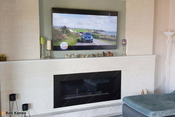 Стильный биокамин в нише под телевизором