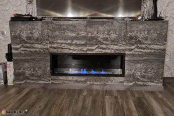 Биокамин в нишу SteelHeat LEADER 1300 модифицировали на заказ под размеры ниши с мраморной облицовкой. Черный цвет биокамина акцентировано выделяется на фоне мрамора, а свет горящего пламени наполняет комнату комфортом и теплом. Линия огня в 90 см делает этот прибор хорошим дополнительным источником обогрева. Огонь отгорожен защитной планкой закаленного стекла. Сзади стоит экран из стемалита, который заметно увеличивает объем пламени.  Очаг биокамина из цельносварного...