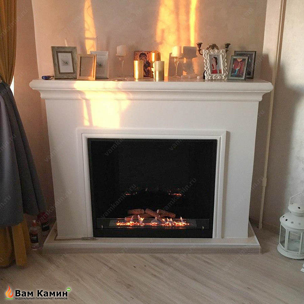 Можно сразу заметить по фото, что такой экокамин отличает узкая рамка. Выбор был сделан в пользу такого размера рамки биокамина, чтобы она гармонично смотрелась в сочетании с порталом. Традиционный черный цвет биокамина также великолепно выглядит на контрасте с белой расцветкой портала.